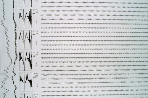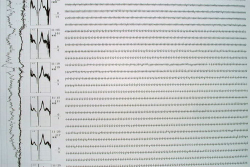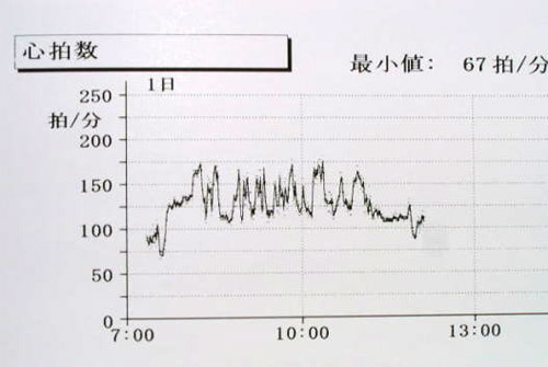 山歩き中の8時から30分間の心電図記録である。心拍数は125〜170と変動が激しい。