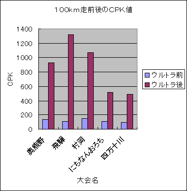 今回の血液検査で大会前のCPK値は97〜145と軽度のバラツキはありますが、正常範囲の40〜200の範囲内にあります。100km走1日後のデータでは489〜1319と上昇がみられます。この中でサプリメント服用後の3大会のうち9月の「村岡」ではサプリメント未服用の2大会と大きな変動はありませんでした。しかしながら、6月の「にちなんおろち」と10月の「四万十川ではCPK値が半減しています。よってこの時同じように服用したサプリメント「ヴァーム2袋とアミノバイタル3袋」は明らかにマラソンによる骨格筋のダメージを軽減する効果があると判断しました。